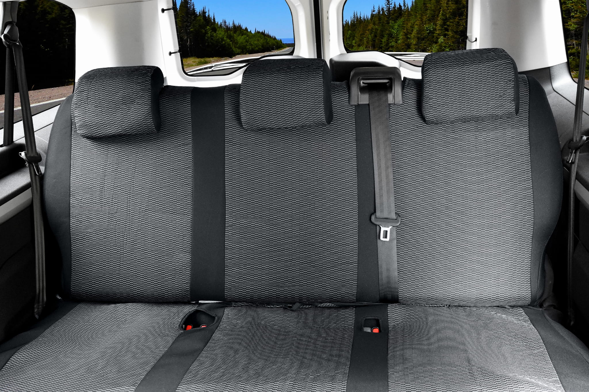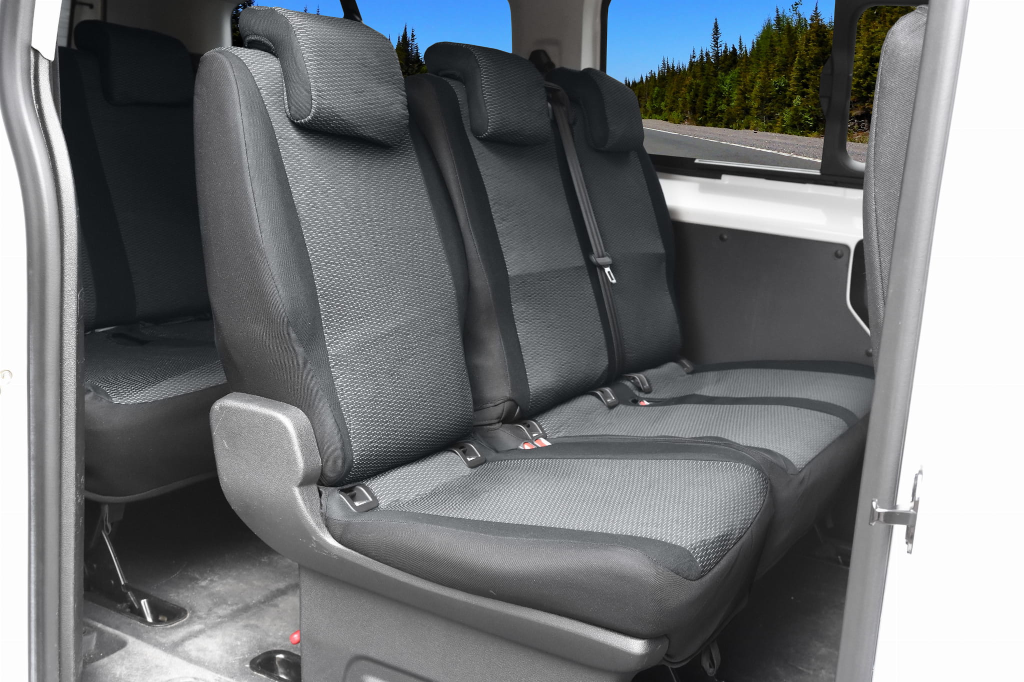 1. rząd: fotel kierowcy: siedzisko, oparcie 1 x zagłówek, kanapa pasażerów: siedzisko w całości, oparcie w całości, 2x zagłówek.