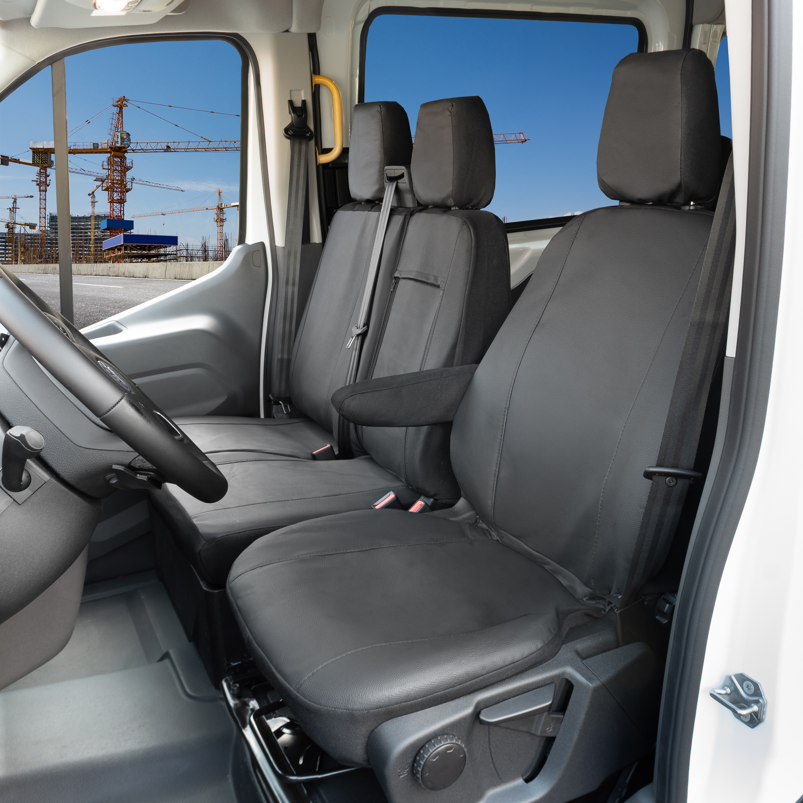 1. rząd: fotel kierowcy: siedzisko, oparcie 1x zagłówek, kanapa pasażerów: siedzisko dzielone na dwie części, oparcie dzielone z otworem (funkcja stolika) 2x zagłówek.