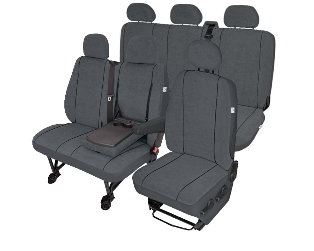 I rząd: pokrowiec kierowcy: siedzisko, oparcie, zagłówek, haczyki montażowe. Pokrowiec pasażera 2 miejsca: siedzisko, oparcie z otworem na stolik, 2 zagłówki, haczyki montażowe.