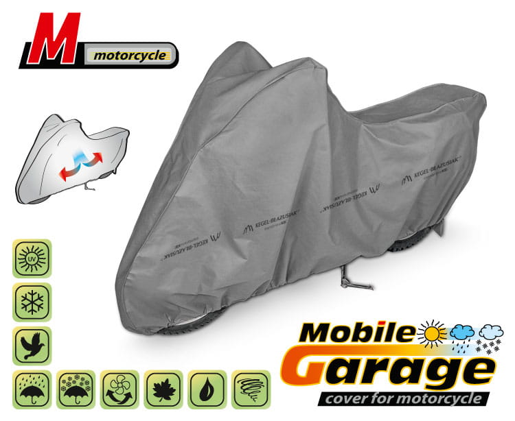 Wysokiej klasy pokrowce na motocykl MOBILE GARAGE, dla wielbicieli jednośladów- wodoodporne i paroprzepuszczalne. Wykonane z trzywarstwowej, nieprzemakalnej membrany paroprzepuszczalnej, która zapewnia prawidłową cyrkulację powietrza wewnątrz pokrowców. Materiał zachowuje niemalże całkowitą szczelność, przy jednoczesnym zapewnieniu odpowiedniego przepływu powietrza, umożliwiającego odprowadzanie wilgoci, gromadzącej się pod pokrowcem a w konsekwencji przeciwdziała powstawaniu korozji. Pokrowce ochronią cały motocykl wraz z jego dolną częścią przed szkodliwym wpływem środowiska. Są odporne na działanie promieni UV. Mocowane za pomocą ściągacza z linką wokół całego pojazdu, prawidłowo zawiązane, zapewniają bezpieczeństwo nawet podczas porywistego wiatru. Dzięki szerokiej gamie kształtów i rozmiarów, pokrowce są dobrze dopasowane do różnych motocykli.