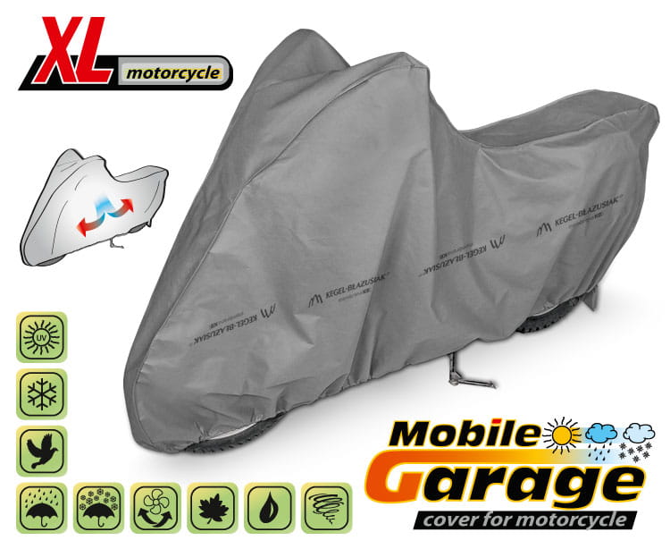Wysokiej klasy pokrowce na motocykl MOBILE GARAGE, dla wielbicieli jednośladów- wodoodporne i paroprzepuszczalne. Wykonane z trzywarstwowej, nieprzemakalnej membrany paroprzepuszczalnej, która zapewnia prawidłową cyrkulację powietrza wewnątrz pokrowców. Materiał zachowuje niemalże całkowitą szczelność, przy jednoczesnym zapewnieniu odpowiedniego przepływu powietrza, umożliwiającego odprowadzanie wilgoci, gromadzącej się pod pokrowcem a w konsekwencji przeciwdziała powstawaniu korozji. Pokrowce ochronią cały motocykl wraz z jego dolną częścią przed szkodliwym wpływem środowiska. Są odporne na działanie promieni UV. Mocowane za pomocą ściągacza z linką wokół całego pojazdu, prawidłowo zawiązane, zapewniają bezpieczeństwo nawet podczas porywistego wiatru. Dzięki szerokiej gamie kształtów i rozmiarów, pokrowce są dobrze dopasowane do różnych motocykli.