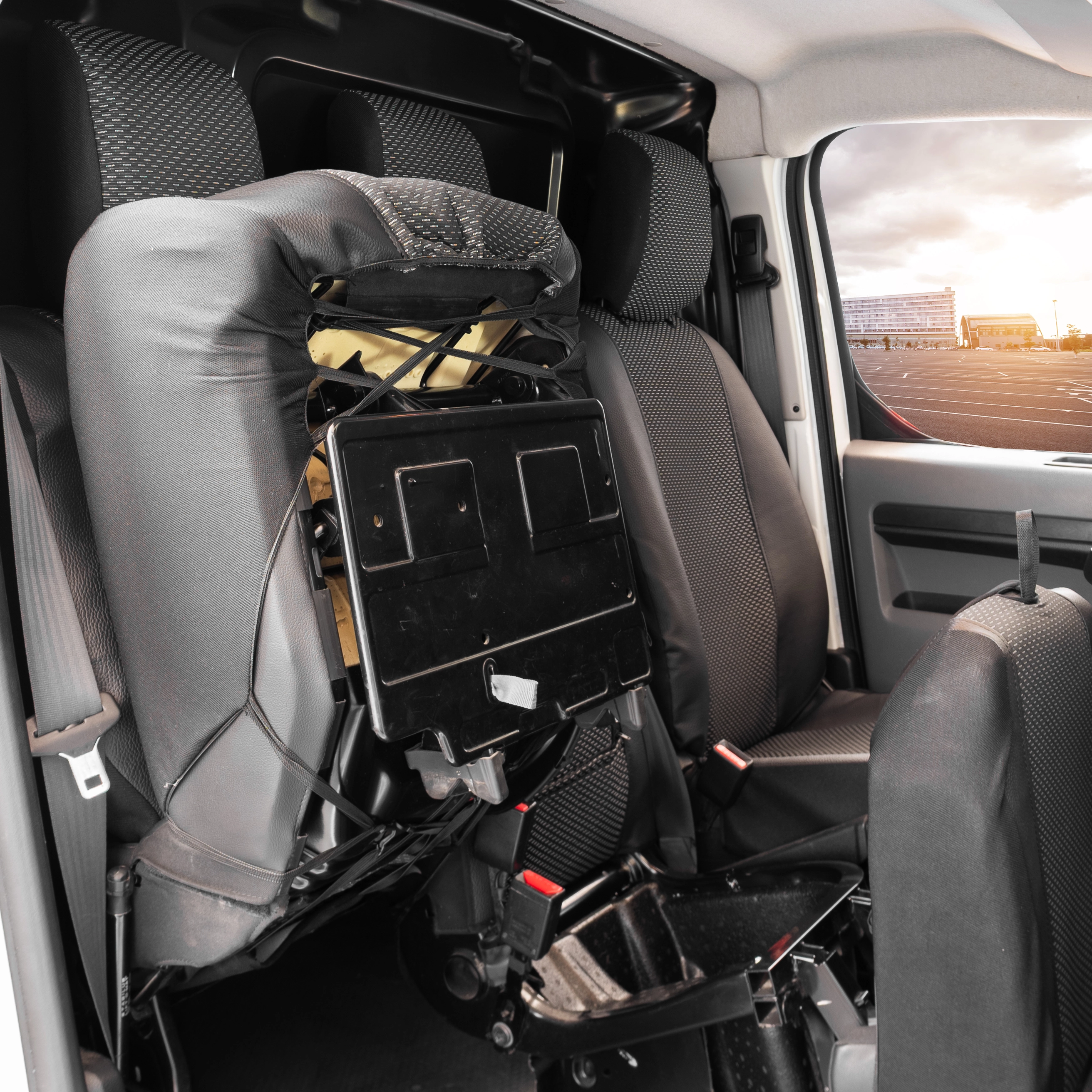 fotel pasażera: siedzisko dzielone na 2 części, oparcie z otworem na stolik, 2x zagłówek. Haczyki montażowe.