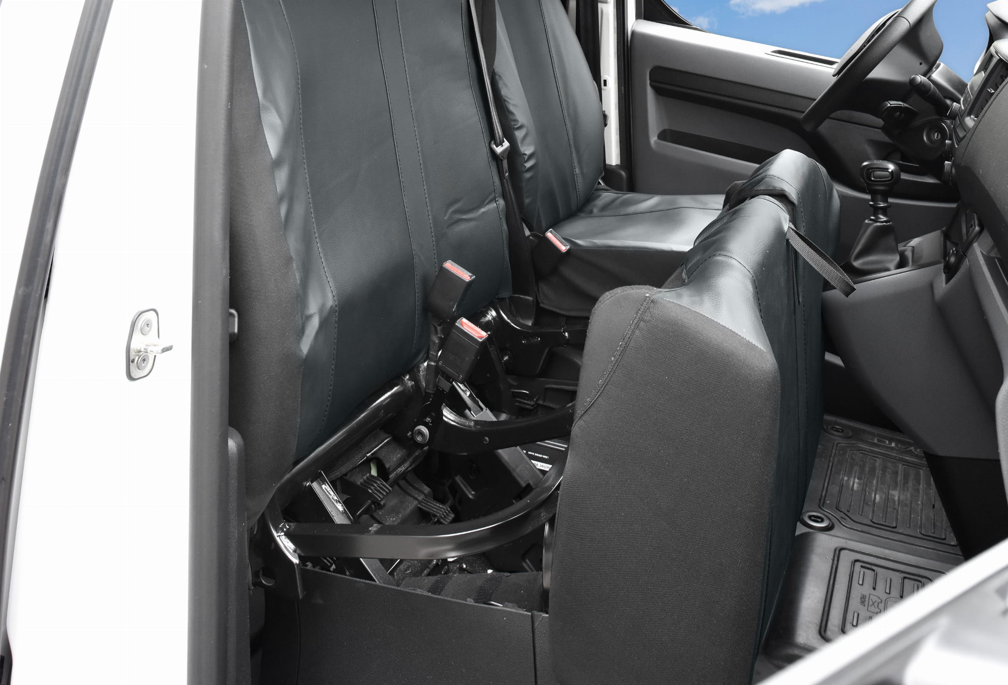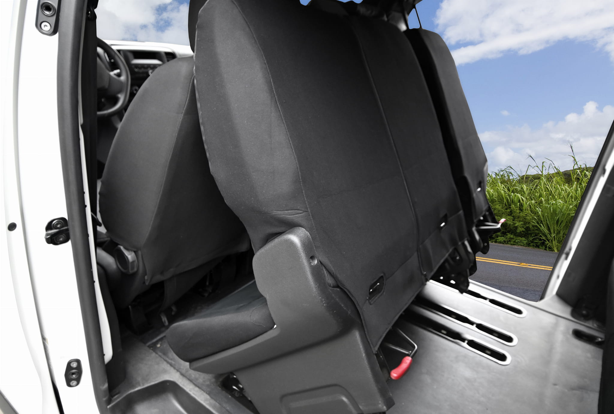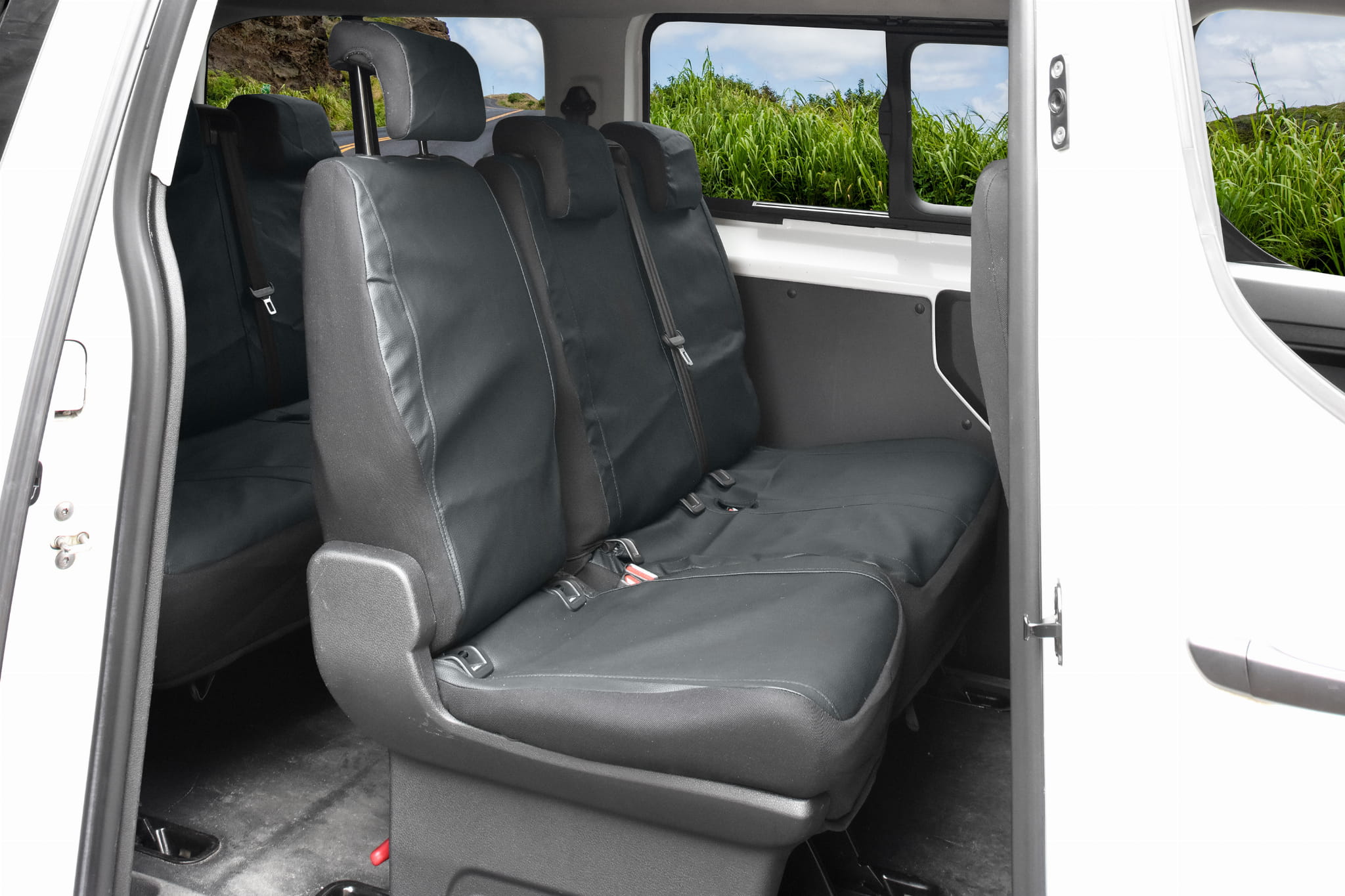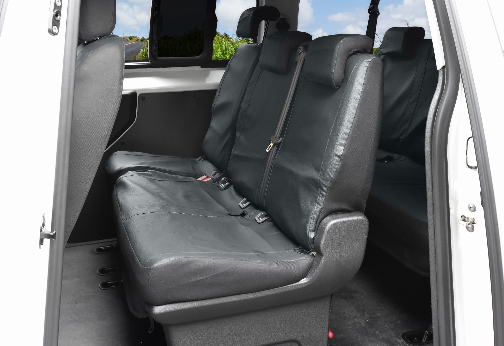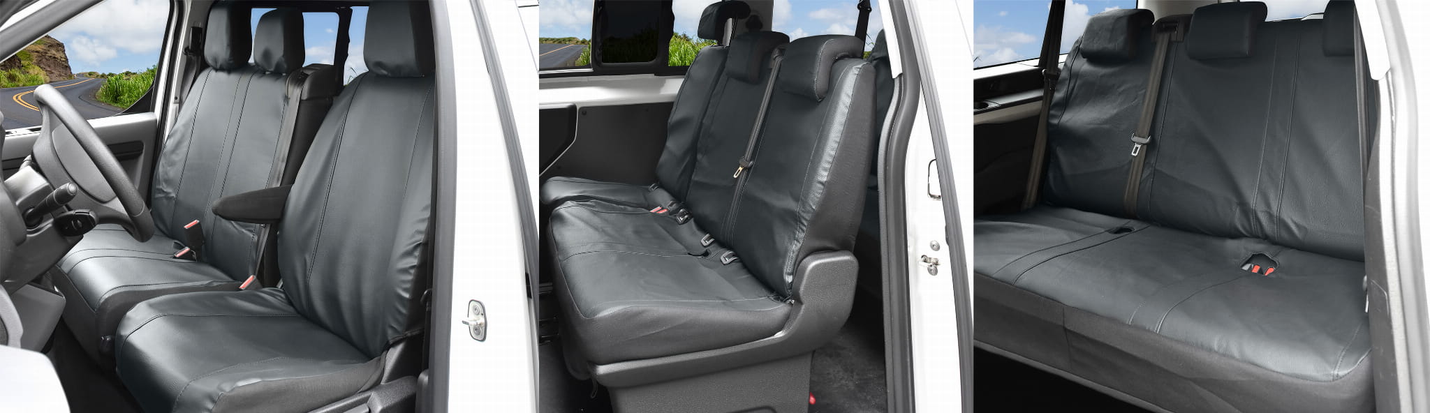 1. rząd: fotel kierowcy: siedzisko, oparcie 1 x zagłówek, kanapa pasażerów: siedzisko w całości, oparcie w całości, 2x zagłówek.