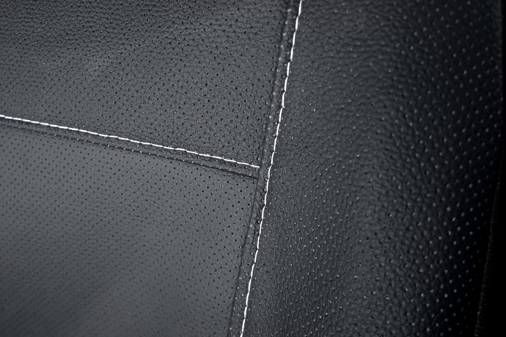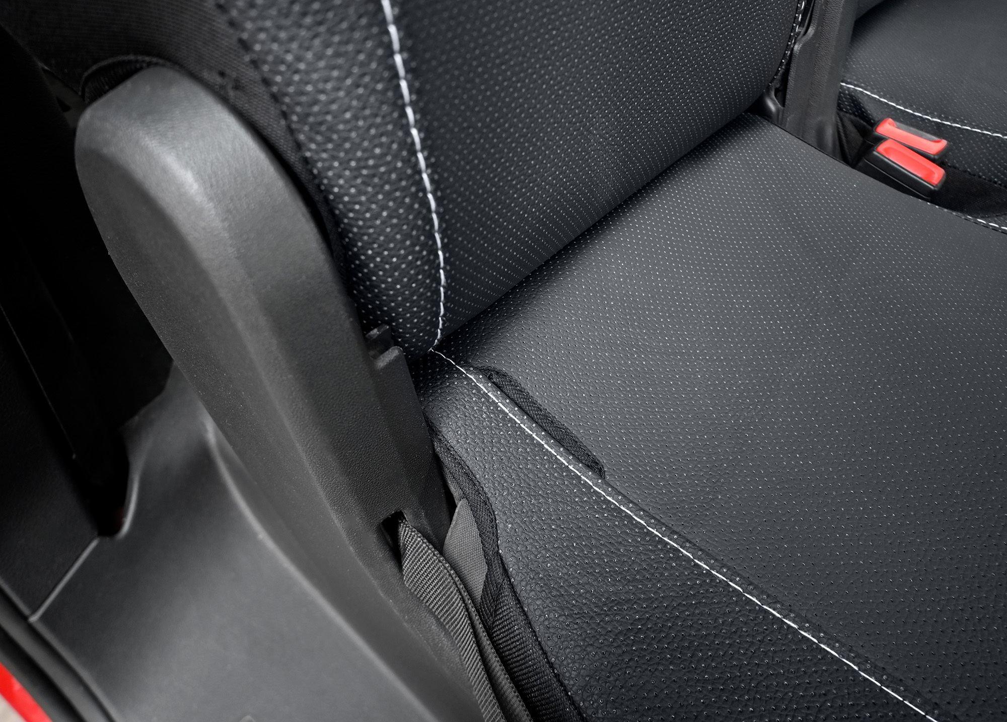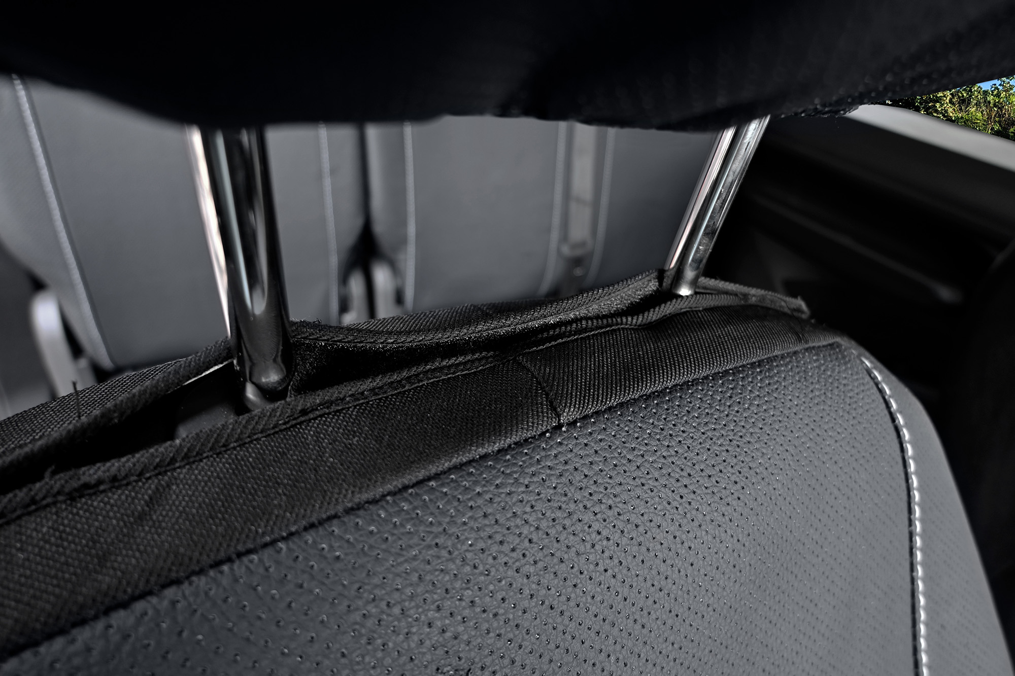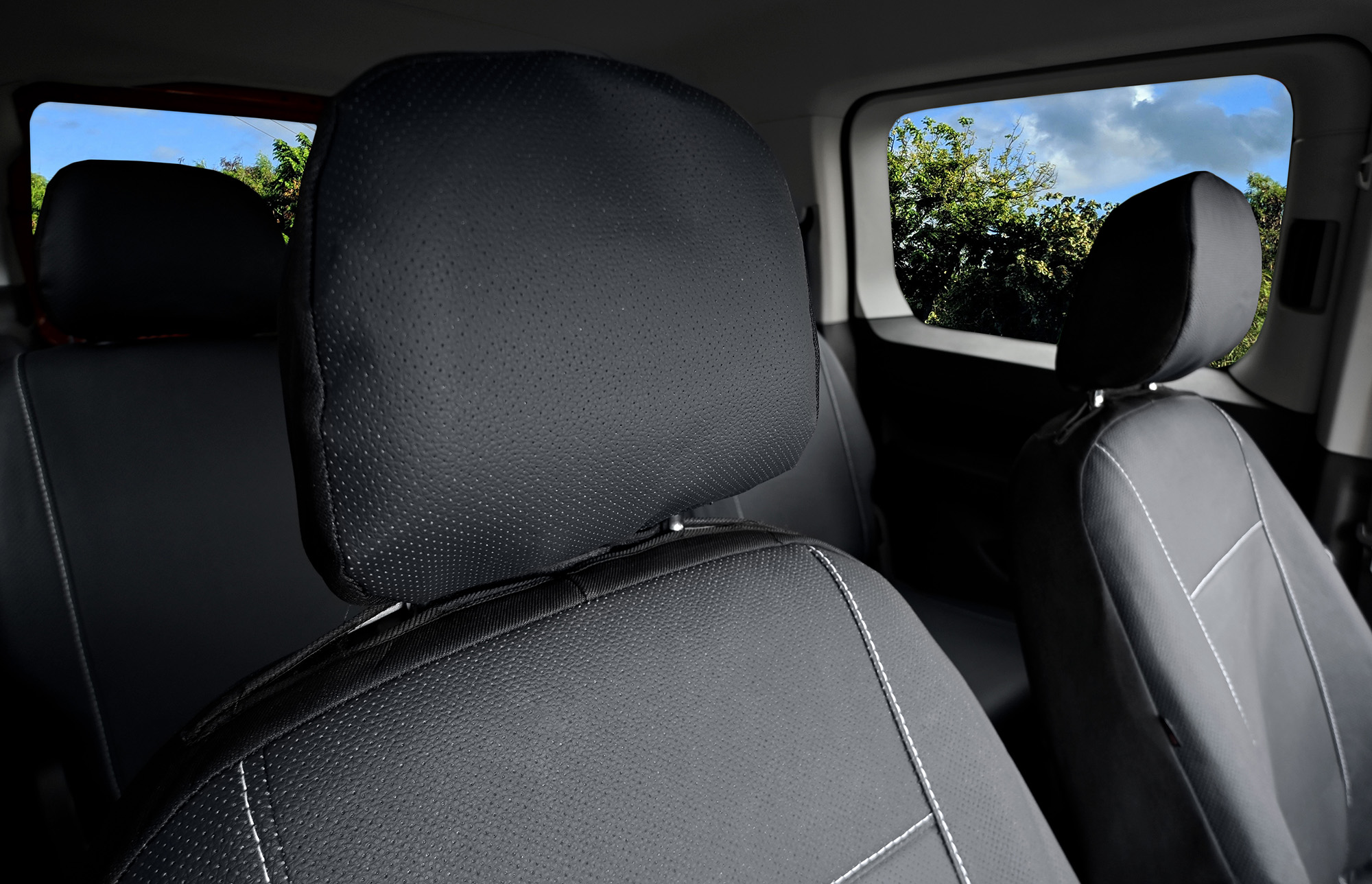 Materiał: Wentylowana eko-skóra (tylne części pokrowców oraz zagłówki wykonane są z czarnego, elastycznego materiału)